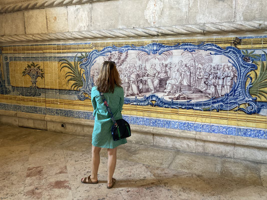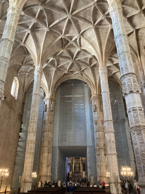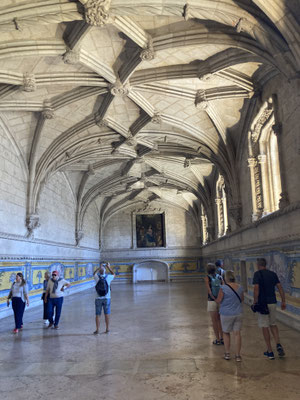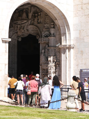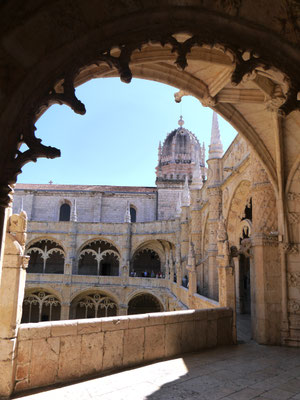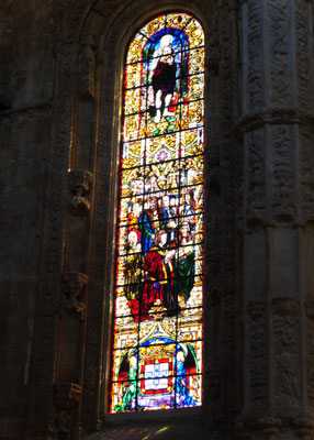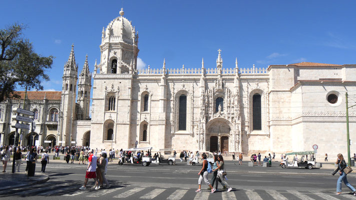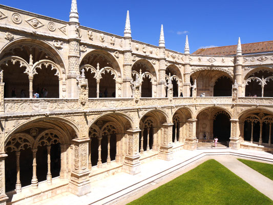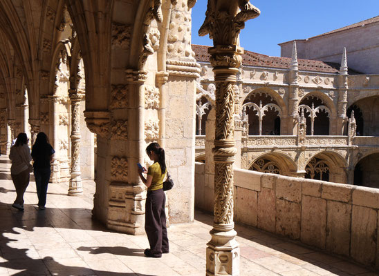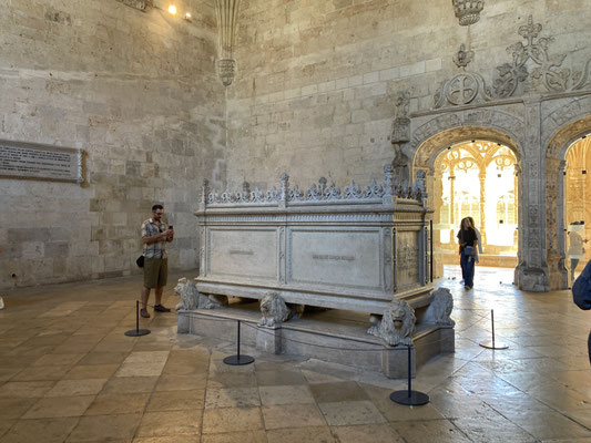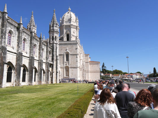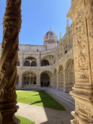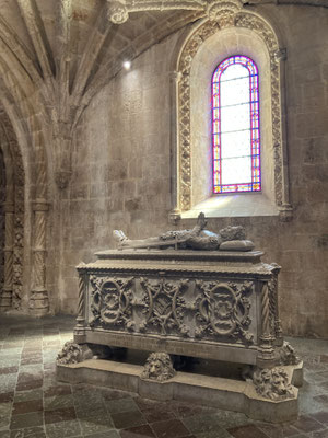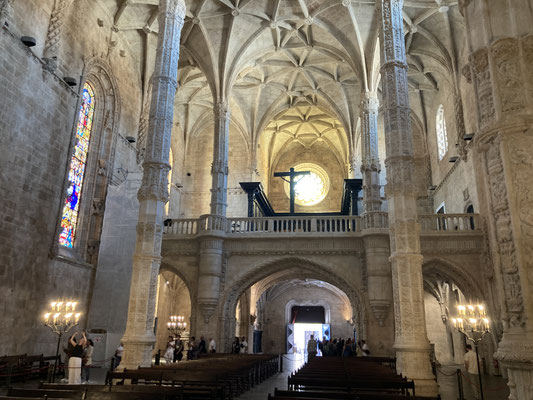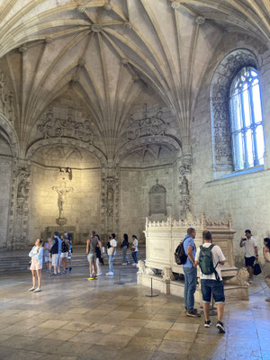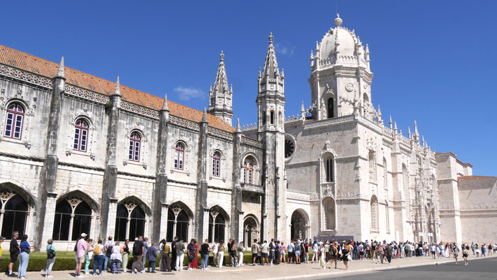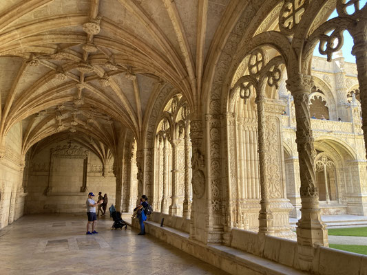 Der Time-Out-Market war zwar nur eine Zwischenstation, für uns aber ein Besuchshighlight! Nun aber holen wird uns an den komplizierten Ticketautomaten zwei der Metrotickets auf Karten und sind in Kürze am Bahnhof Belém, laufen am ehemaligen Königsschloss (heute Sitz des portugiesischen Präsidenten) vorbei, durch eine schöne Parkanlage mit thailändischem Pavillion und zahlreichen Denkmälern und stehen dann vor dem imposanten Klosterdenkmal Mosteiro dos Jerónimo mit der schönen Igreja de Santa Maria de Belém. Ein aus hellem Stein gebauter, reich geschmückter Klosterkoloss liegt vor uns in der Sonne. So beeindruckend wie der Bau selbst, so beeindruckend ist allerdings auch die lange Warte-schlange zu seinem Einlass... Gleichwohl geht es recht schnell und wir durchlaufen nach gut 30 Minuten den imposant geschmückten Kreuzgang auf zwei Ebenen dieses in atemberaubender Manuelinik - jener spätgotischen portugiesischen Stilrichtung - gestalteten Gebäudes, seine Nebenräume und Grabkammern sowie die angeschlossene Kirche mit wundervoll farblich gestalteten Fenstern.