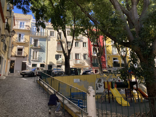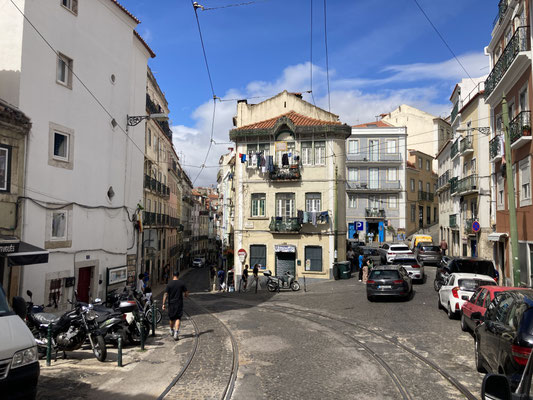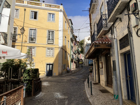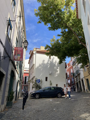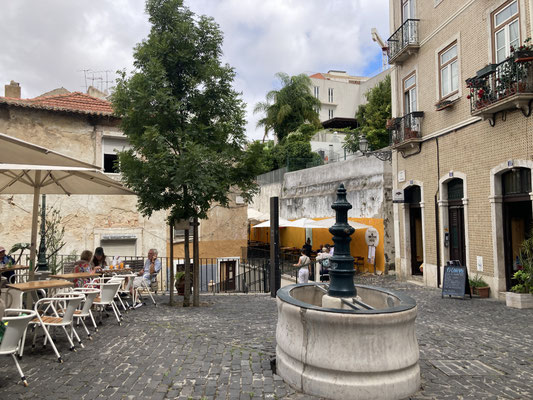 Und so schließen wir heute den Kreis, indem wir - immer rund um die felsigen Fundamente und das Gemäuer des Castelo laufend - irgendwann wieder die hoch gelegenen Gassen Alfamas erreichen. Vorbei am trubeligen Miradouro de Santa Luzia, zu dem sich auch heute die zahlreichen historischen Remodelado - Bahnen quitschend herauf quälen, gelangen wir in steilem Treppenabstieg irgendwann wieder zu unserem kleinen Platz zurück. Es schreit nun nach einer Siesta - denn dieses Auf und Ab geht ganz schön in die Beine... Am Abend entdecken wir endlich - ganz in der Nähe unserer Wohnung - ein nettes kleines Lokal, u.a. mit den gegrillten, typisch portugiesischen Sardinen im Angebot, das auch qualitativ richtig gut ist. Später laufen wir zu dem uns schon vom lezten Jahr her bekannten kleinen Platz in der Umgebung und trinken in der uns bekannten Bar, der Tasca do Sr. Matos, den ein oder anderen portugiesischen Sangria im Freien... Für die ansonsten auch hervorragende Tapas hier ist heute allerdings kein Platz mehr vorhanden... Schade!