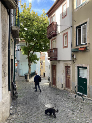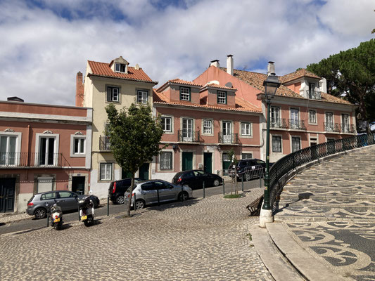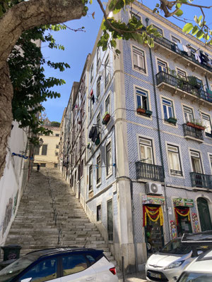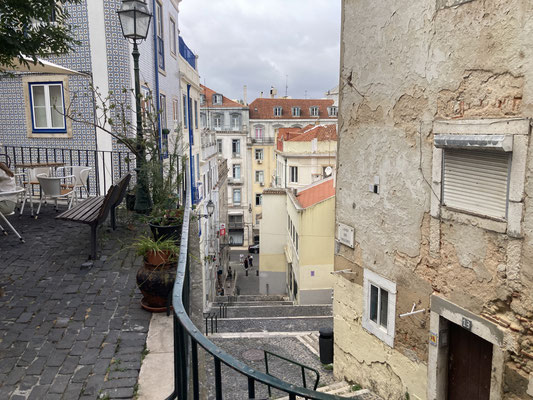 Wir berauschen uns an den wundervoll verlegten Kopfsteinpflastern in der Stadt die Sinne, inhallieren die frische Meeresluft und sammeln irgendwann im Hotel unseren Koffer ein, um in unsere eigentliche Wohngegend umzuziehen: Zu Fuß geht es über enge Gässchen, Kopfsteinpflaster und steile Treppen in den Alfama-Kiez. Mit einem Rollkoffer eine echte Herausforderung und ich ärgere mich "schwarz", dass ich nicht meinen Trekking-Rucksack bei mir habe... Nicht weit entfernt von unserer letztmaligen Wohnung beziehen wir auch dieses Mal eine kleine, gemütliche und wundervoll gestaltete Altstadtbude mitten im schönsten, aber auch touristischen Alfama und sind erneut mit unserer Wahl mega-zufrieden und über den Move glücklich... Hier werden wir uns die paar Tage in der Stadt wohlfühlen und können uns von anstrengenden Touren über die Hügel der City gut erholen...