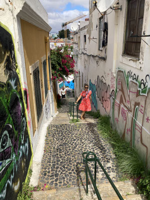 Spektakulär wird es erneut im Mouraria - Kiez, zu dem wir nun atemberaubend über steile Treppchen, umgeben von Streetart und allerlei tollen Aus-blicken, von Graça aus hinabsteigen. Immer verschachtelter gestalten sich hier die Straßenzüge, immer verwinkelter geht es die alten Gassen rauf und runter. Immer wieder steile Treppensteige, gelegentlich lange Rolltreppen, zumeist schwergängige steile Straßenrampen... Immer wieder blicken wir - nun wieder von oben - in steile, schmalste verschattete Treppenschluchten, stoßen wir hinter der nächsten Ecke auf versteckte Bodegas oder Tapasbars... Mouraria - vor allem hier oben, zu Füßen der Mauern des Castelo - ist mindestens so attraktiv wie Alfama und hält zahlreiche gute Restaurants und Szenebars in der Hinterhand. Wer verschachtelte Städte an steilen Hügeln mag, gassenreiche Altstädte liebt und einen schon erheblichen Grad an touristischer Erschlossenheit durchaus schätzt, der wird hier voll auf seine Kosten kommen...